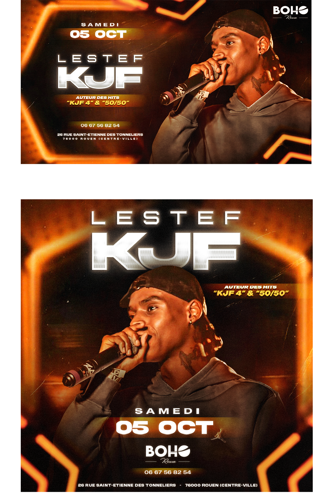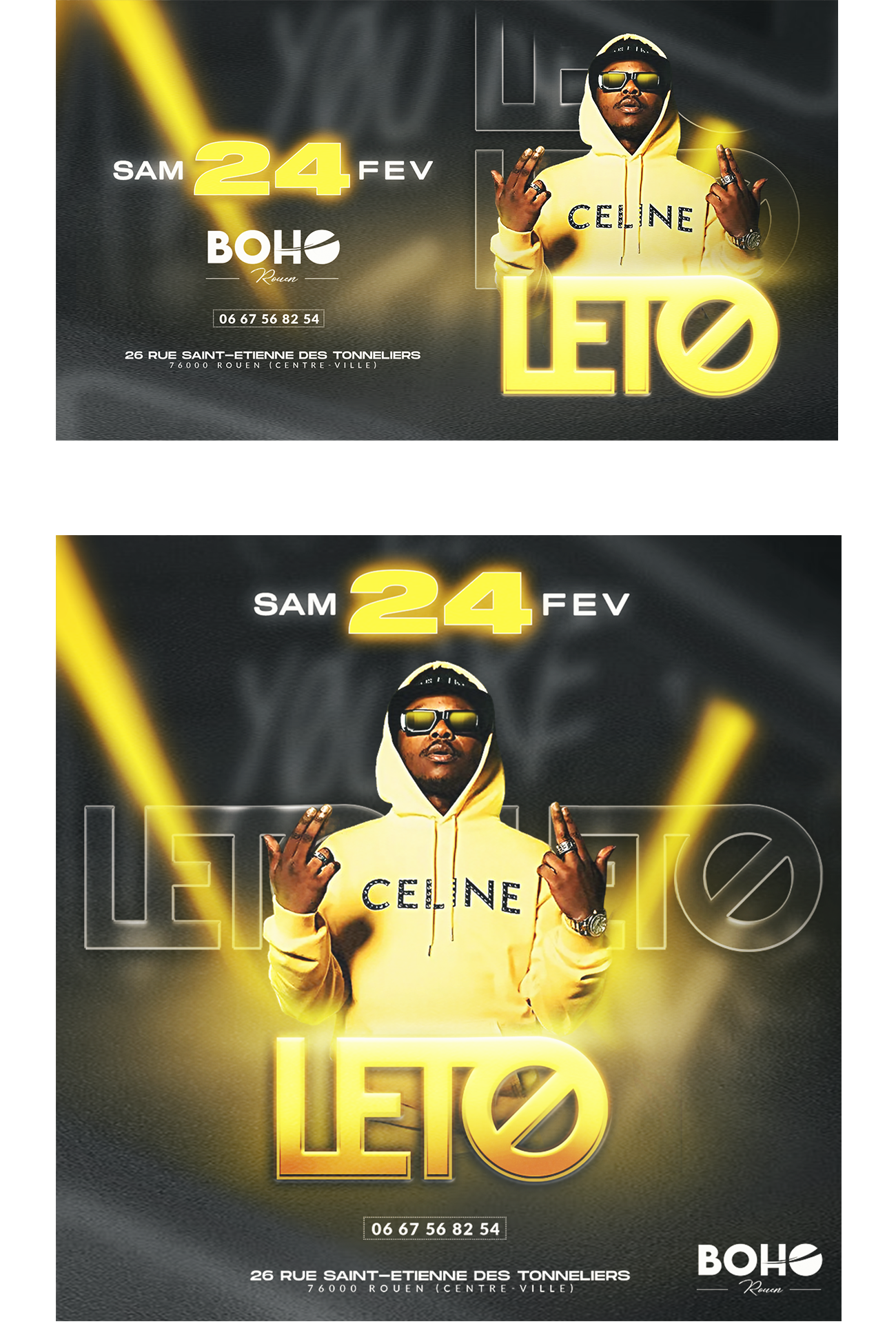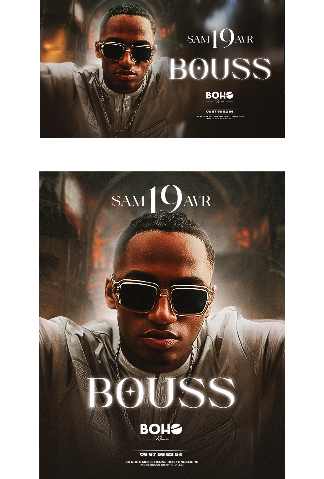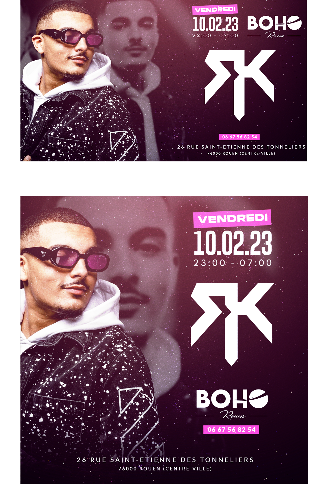 Depuis Décembre 2022, nous travaillons avec la discothèque BOHO, référence de la vie nocturne à Rouen, afin de réaliser leur visuel de showcases.
